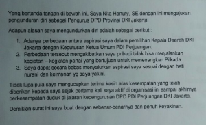 Jakarta, Aktual.com – Wakil Ketua Bidang Kebudayaan Dewan Pimpinan Daerah PDI Perjuangan DKI Jakarta, Nita Hertuty, mengundurkan diri dari jabatannya karena perbedaan sikap dengan Ketua Umum Megawati Soekarnoputri. Utamanya terkait dengan keputusan partainya mengusung Basuki Tjahaja Purnama (Ahok) sebagai Calon Gubernur dalam Pilkada DKI 2017.