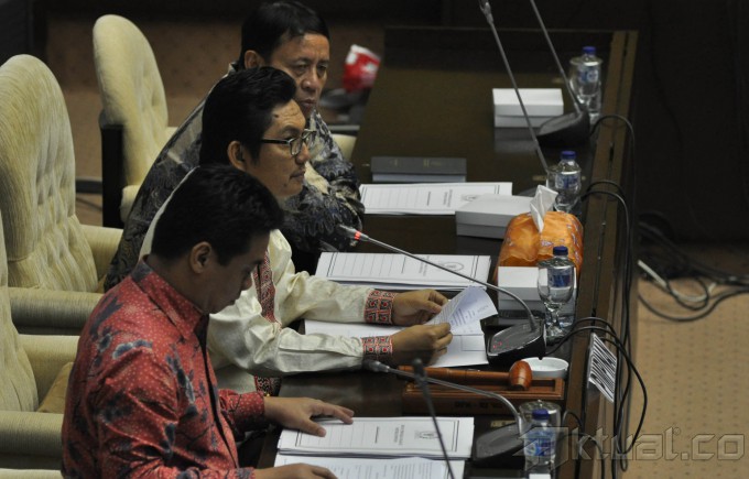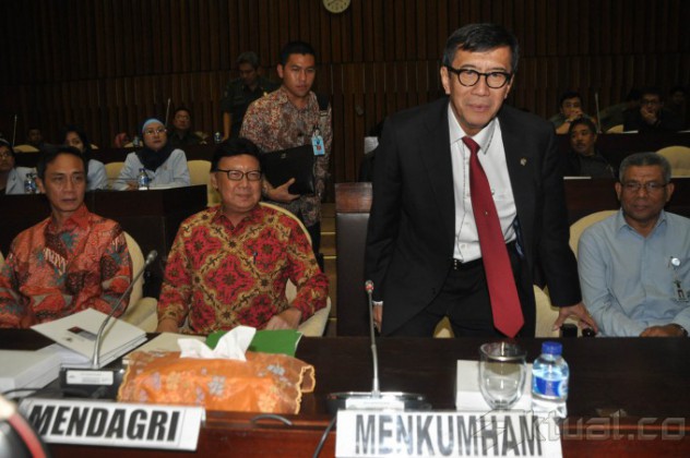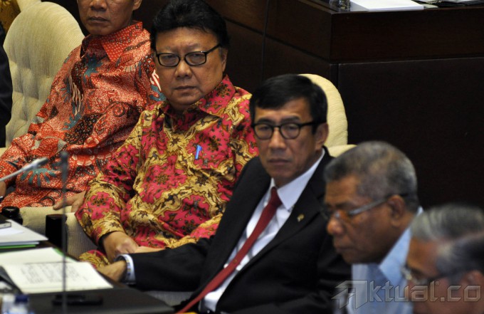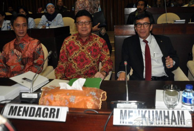 Mendagri Tjahjo Kumolo dan Menteri Hukum dan HAM Yasonna Laoly saat menghadiri Rapat Kerja dengan Komisi II DPR, Jakarta, Senin (19/1/2015). Agenda rapat tentang pengesahan UUD Pilkada dan penandatanganan naskah RUU tentang Penetapan Perpu Nomor 1 dan 2 Tahun 2014. AKTUAL/JUNAIDI MAHBUB