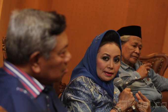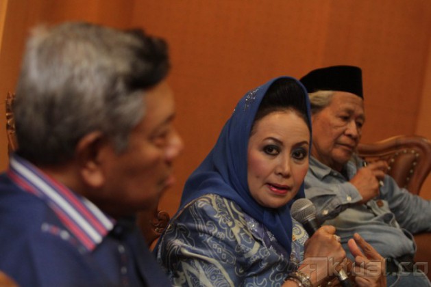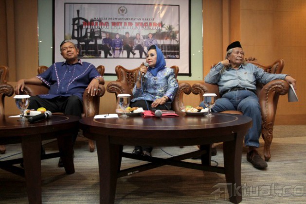 Wakil Ketua MPR Melani Leimena Suharli (tengah) bersama Anggota Panitia Pemberian Gelar Pahlawan Bambang W. Suharto (kiri) dan Budayawan Ridwan Saidi (kanan) menjadi pembicara dalam Dialog Pilar Negara di Kompleks Parlemen, Senayan, Jakarta, Senin (11/11/2013). Dialog tersebut membahas soal sikap kepahlawanan dalam kepemimpinan tahun 2014. Aktual/Tino Oktaviano