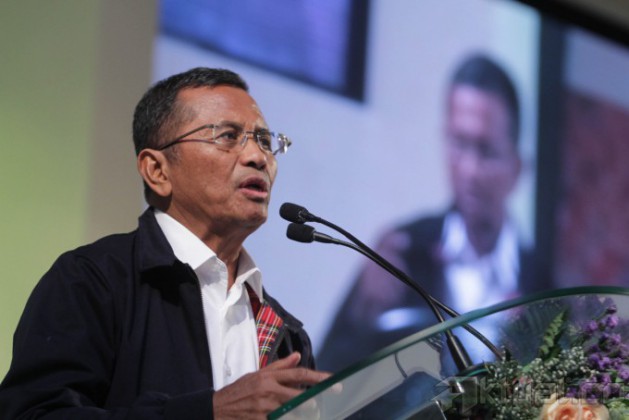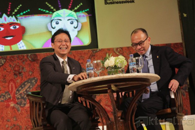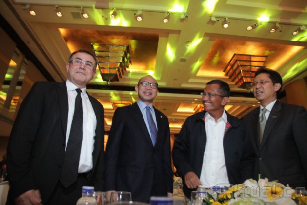 Menteri BUMN Dahlan Iskan (kedua kanan), Menteri Keuangan Chatib Basri (kedua kiri), Dirut Bank Mandiri Budi G Sadikin (kanan) dan Ekonom dari Universitas New York Nouriel Roubini (kiri), berbincang saat acara Mandiri Investment Forum 2013 di Jakarta, Senin (11/11/2013). Forum yang mengambil tema Indonesia, Preparing For The New Era ini bertujuan sebagai ajang sharing informasi antara regulator dengan 400 investor dalam dan luar negeri mengenai iklim investasi di Indonesia terkini. Aktual/Tino Oktaviano