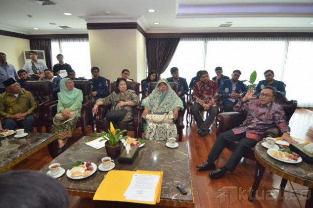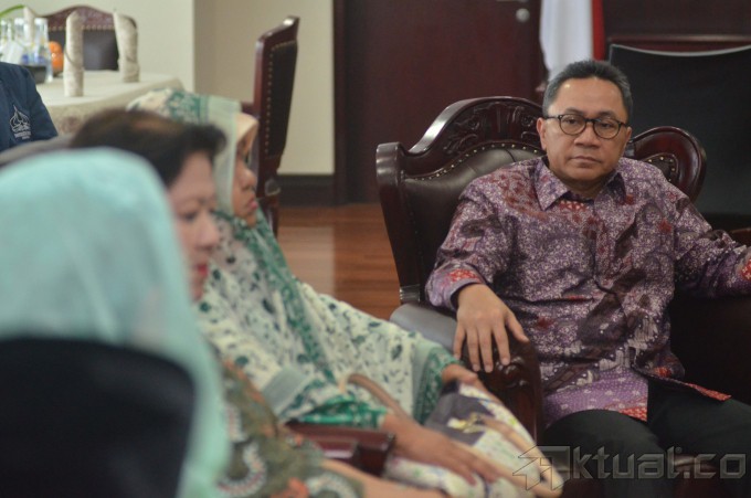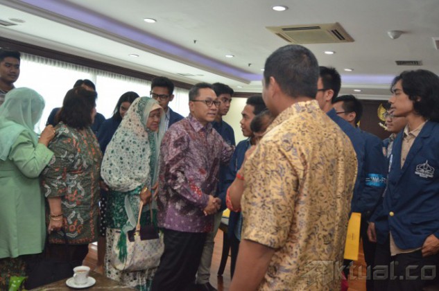 Ketua MPR RI Zulkifli Hasan (kiri) menerima audiensi dari keluarga korban penembakan Trisakti 12 Mei 1998 dan Badan Eksekutif Mahasiswa (BEM) Universitas Trisakti di Ruang Kerja Pimpinan, Kompleks Parlemen Senayan, Jakarta Selatan, Senin (18/5/2015). Dalam audiensi tersebut keluarga korban meminta Ketua MPR untuk mendesak pemerintah segera menuntaskan kasus yang belum terungkap selama 17 tahun itu. AKTUA/JUNAIDI MAHBUB