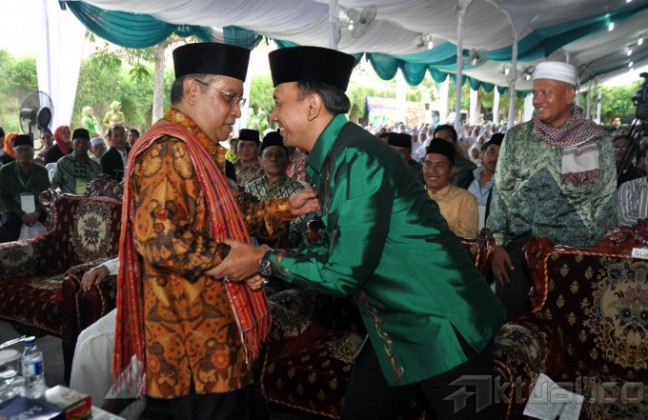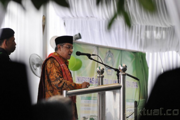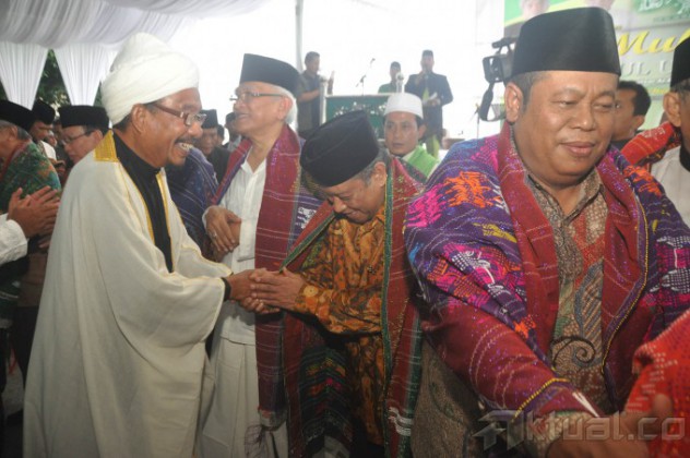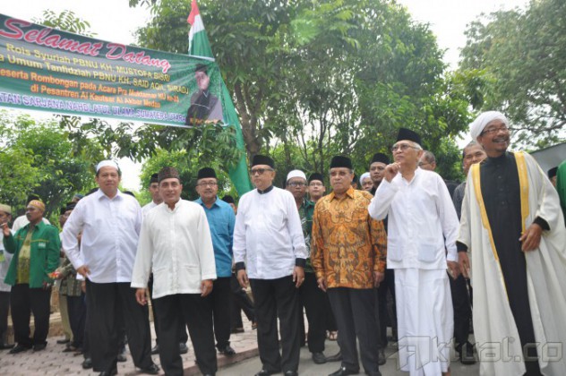 Ketua Umum Pengurus Besar Nahdlatul Ulama (PBNU), KH Said Aqil Siroj bersalaman dengan Gubernur Sumatera Utara (Sumut), Gatot Pujo Nugroho pada acara Pra Muktamar ke-33 Nahdlatul Ulama yang berlangsung di Pesantren al-Akbar al-Kautsar, Jalan Pelajar Timur, Medan, Sumatera Utara, Sabtu (16/6/2015). Pra Muktamar di Medan bertema “Kedaulatan dan Pemerataan Ekonomi (Konsep dan Perundang-undangan)” AKTUAL/JUANAIDI MAHBUB