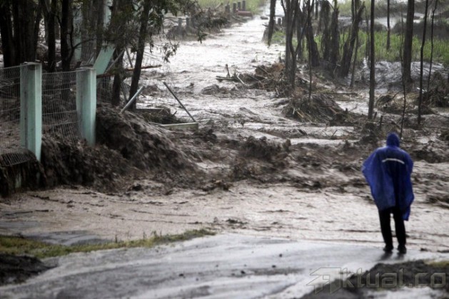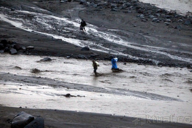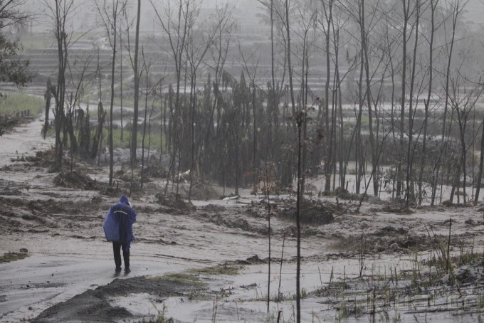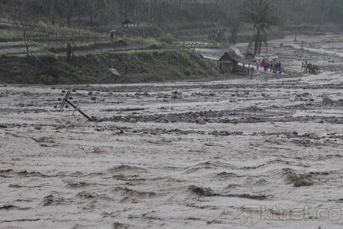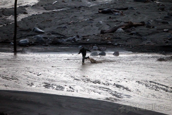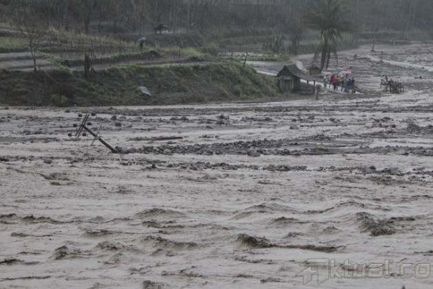 Seorang Warga nekad menerobos sisa lahar dingin yang memutuskan akses jalan menuju Desa Pandansari, Kecamatan Ngantang, Malang, Selasa (18/2/2014). Hujan deras yang turun di puncak kawah Gunung Kelud menyebabkan terjadinya lahar dingin yang memutuskan jalan Desa Pandansari yang memiliki 6 Dusun. Aktual.co