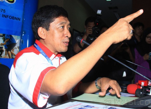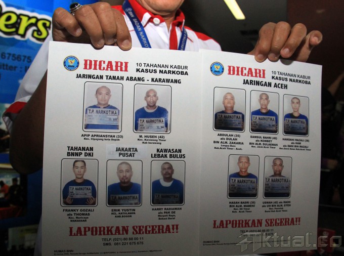 Kepala Humas Badan Narkotika Nasional (BNN) Slamet Pribadi menunjukkan foto 10 tahanan yang kabur dari rutan, saat memberikan keterangan pers di kantor BNN, Jalan MT Haryono, Cawang, Jakarta Timur, Selasa (31/3/2015). 10 tahanan ini kabur dengan membobol tembok rutan pada pukul 03.30 WIB. AKTUAL/MUNZIR