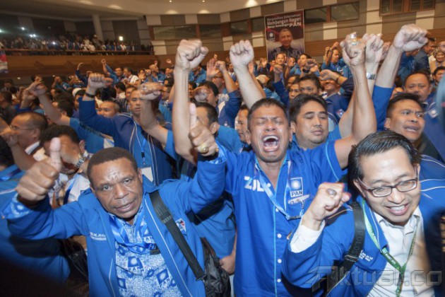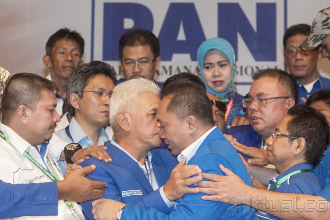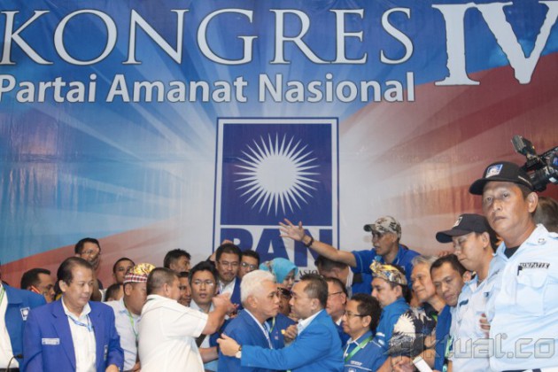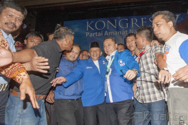 Ketua Umum PAN Terpilih Zulkifli Hasan (kanan) memeluk Ketua Umum PAN periode 2010-2015 Hatta Rajasa (kiri) usai pemilihan ketua umum PAN periode 2015-2020 pada Kongres IV Partai Amanat Nasional (PAN) di Hotel Westin, Nusa Dua, Bali, Minggu (1/3). Zulkifli Hasan unggul enam suara dari Hatta Rajasa dalam pemungutan suara pemilihan ketua umum PAN. ANTARA FOTO/Rosa Panggabean