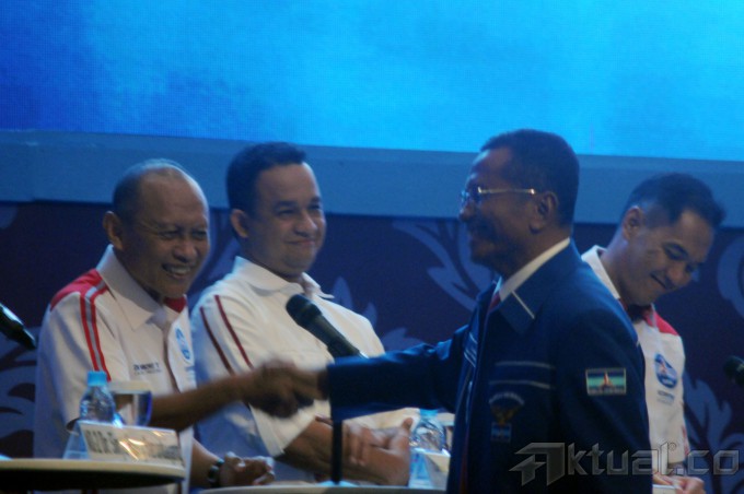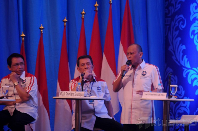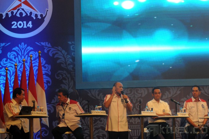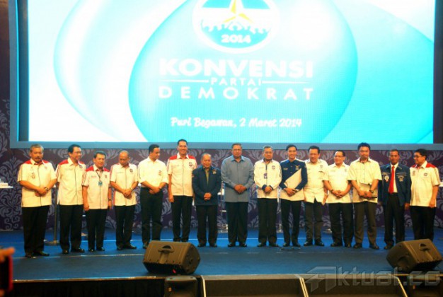 Para peserta konvensi capres Partai Demokrat Pramono Edhie Wibowo (tengah) disaksikan Anies Baswedan (kedua kanan), Marzuki Alie (kiri), Gita Wirjawan (kanan), Sinyo Harry Sarundajang (kedua kiri),memberikan pandangan saat Debat Bernegara di Bogor, Jabar, Minggu (2/3/2014). Debat bernegara kali ini mengusung tema Hubungan Internasional dan Kesejahteraan Rakyat. Aktual/str