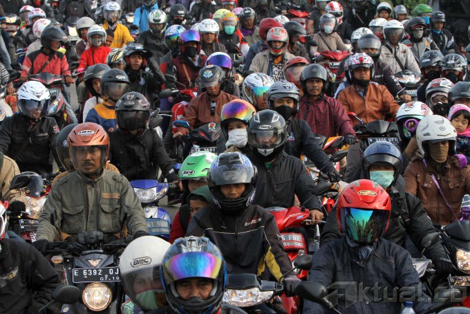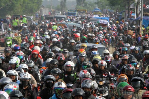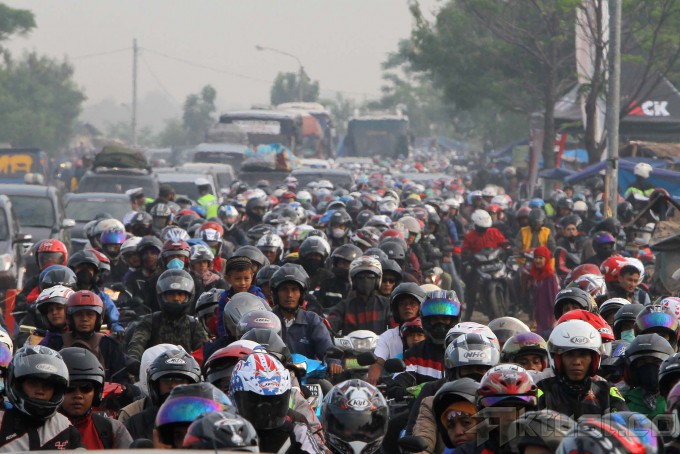 Pemudik sepeda motor memadati jalur Karawang – Cikampek di Desa Lamaran, Karawang, Jawa Barat, Sabtu (26/7/2014). Arus mudik kendaraan roda dua diperkirakan mengalami puncak kepadatan pada Sabtu malam hingga Minggu, dengan volume sekitar 9000 kendaraan per jam. Aktual/Tino Oktaviano