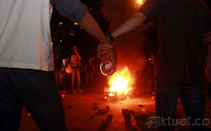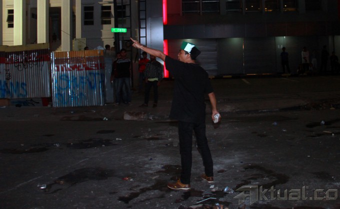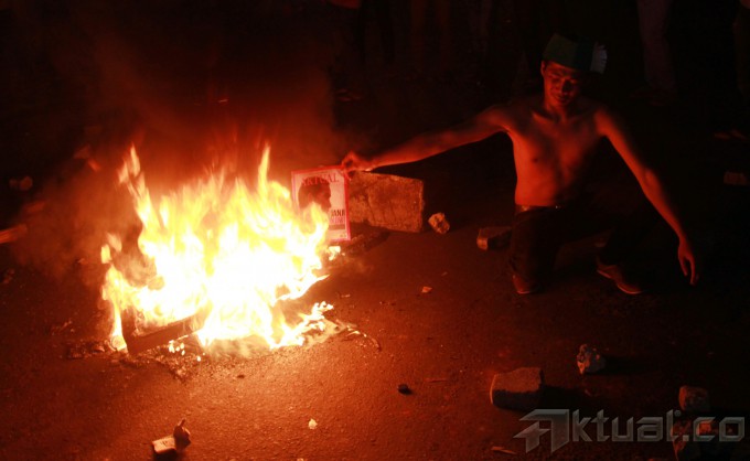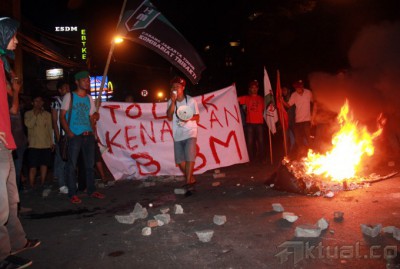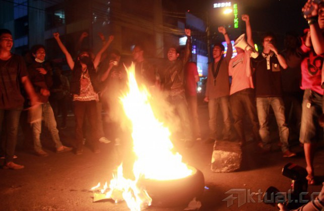 Mahasiswa yang tegabung dalam Himpunan Mahasiswa Islam (HMI) melakukan aksi unjuk rasa yang diwarnai bakar ban di jalan Cikini Raya, Jakarta, Senin (17/11/2014), Aksi ini menyambut pidato Presiden Joko Widodo yang memutuskan untuk menaikkan harga bahan bakar minyak (BBM) sebesar Rp 2.000 pada hari ke-27 sejak ia menjabat Presiden RI 20 Oktober lalu. AKTUAL/TINO OKTAVIANO