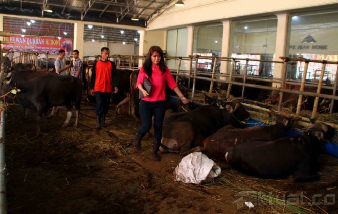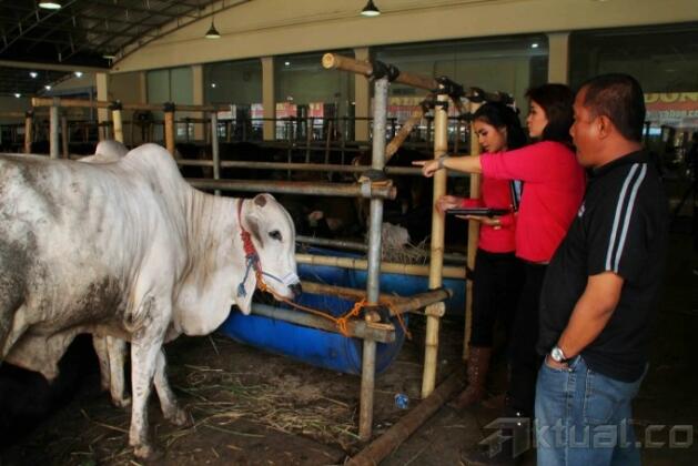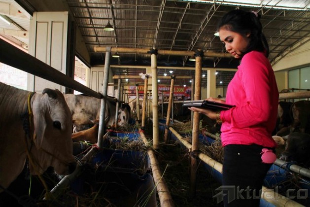 Sejumlah wanita cantik menjadi Sales Promotion Girl (SPG) di mal hewan kurban di kawasan Kelapa Dua, Depok, Jawa Barat, Minggu (13/10/2013). Hewan kurban jenis sapi dan kerbau yang dijual di tempat ini dibanderol dengan harga mulai dari Rp 10 juta sampai Rp 200 juta. Aktual/Oke Dwi Atmaja