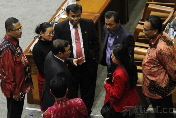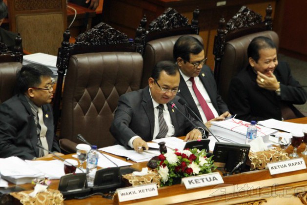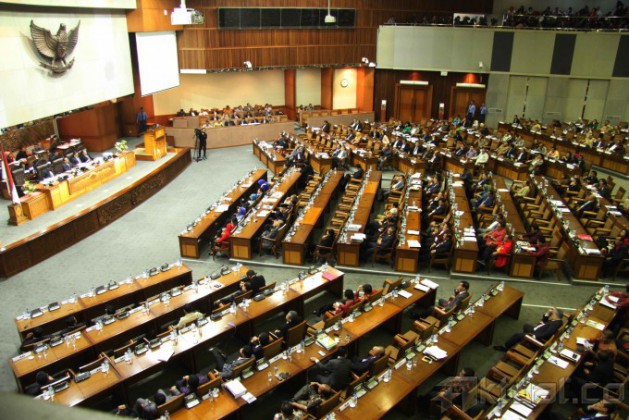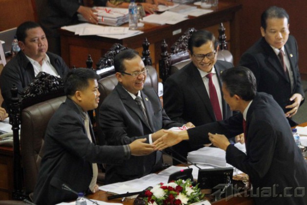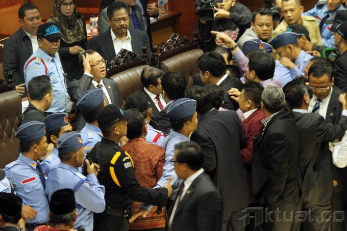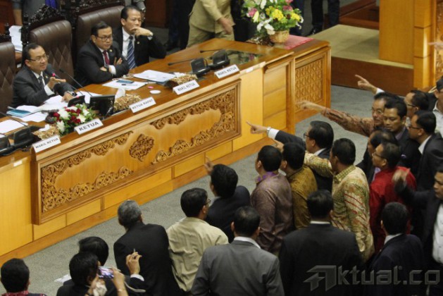 Pimpinan DPR mengetuk palu saat mengesahkan RUU Pilkada usai melalui voting saat paripurna dengan agenda pembahasan pengesahan RUU Pemilihan Kepala Daerah di Kompleks Parlemen, Senayan, Jakarta, Jumat (26/9/2014), dini hari. Voting RUU Pilkada mayoritas anggota DPR yang hadir di paripurna memberikan suaranya untuk mengembalikan pemilihan pilkada lewat DPRD. Ada 361 anggota DPR yang mengikuti voting ini. Hasilnya, 135 anggota DPR mendukung pilkada langsung dan 226 mendukung pilkada lewat DPRD. AKTUAL/TINO OKTAVIANO