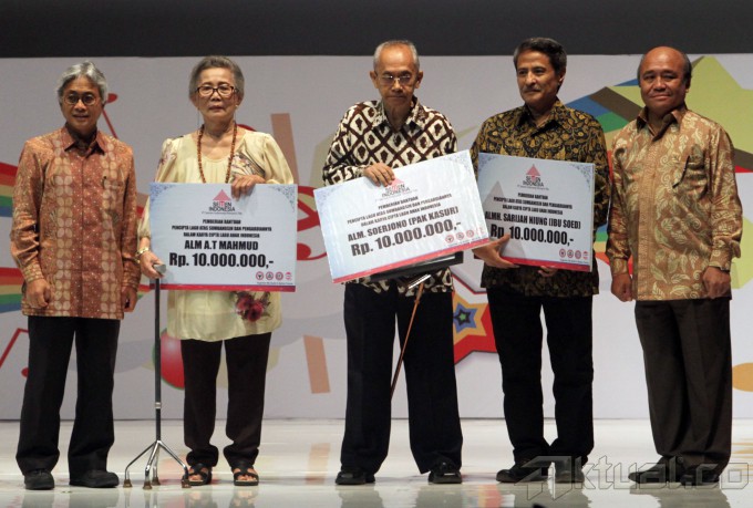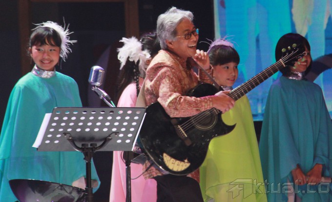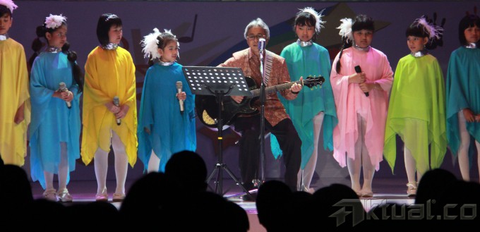 Direktur Utama Semen Indonesia Dwi Soetjipto bernyanyi bersama anak-anak disela Kompetisi Suara Anak Indonesia (Kirana) PT Semen Indonesia (Persero) Tbk yang diselenggarakan di 29 kota seluruh Indonesia saat babak final di XXI CLUB, Djakarta Theatre, Jakarta Pusat, Mingu (30/3/2014). Kirana merupakan lomba menyanyi lagu anak yang diperuntukkan untuk anak – anak usia 7 – 11 tahun yang diselenggarakan melalui program Corporate Social Responsibility (CSR) Semen Indonesia dengan maksud ingin membangun dan mengembalikan karakter anak-anak Indonesia. Kompetisi ini memperebutkan tiket 10 besar dengan total hadiah Rp 405 juta. Aktual/Tino Oktavaino