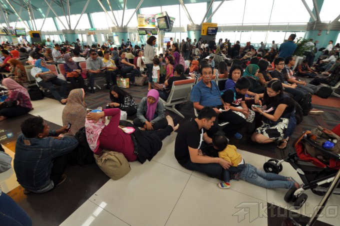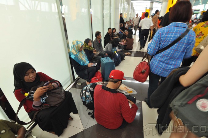 Ratusan orang menunggu penerbangan yang terlambat di ruang tunggu terminal 3 Bandar udara Soekarno Hatta, Tangerang, Banten, Rabu (18/2). PT Angkasa Pura II atau AP II menyatakan lima penerbangan yang mengalami keterlambatan (delay) kemarin di Bandara Internasional Soekarno-Hatta (Soetta) , baru bisa diberangkatkan hari ini.ANTARA FOTO/Lucky R.