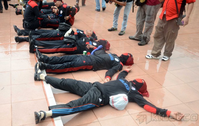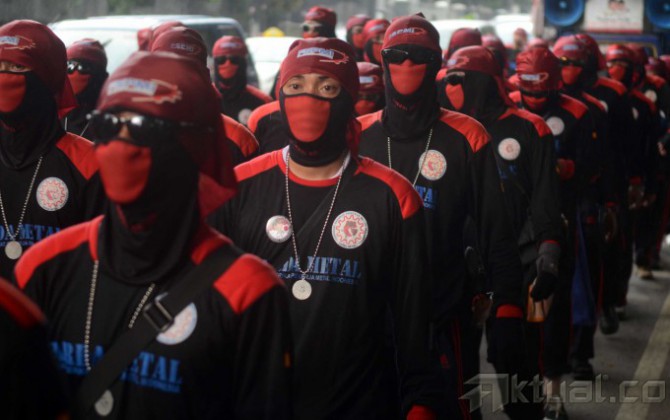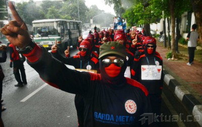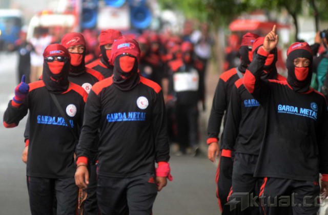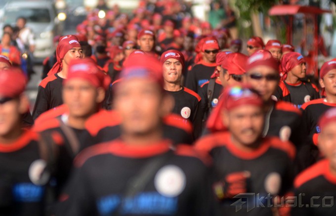 Ratusan Buruh yang tergabung dalam Konfederasi Serikat Pekerja Indonesia (KSPI) yang melakukan aksi jalan kaki (longmarch) Bandung-Jakarta tiba di kawasan Tugu Proklamasi, Jakarta, Jumat (13/6/2014). Aksi tersebut sebagai bentuk dukungan dan sosialisasi atas Sepuluh Tuntutan Buruh dan Masyarakat (Sepultura) yang telah disepakati dan ditandatangani oleh pasangan capres-cawapres Prabowo-Hatta. Aktual/Tino Oktaviano