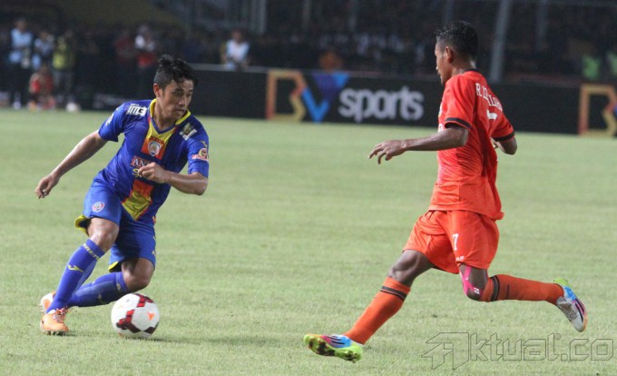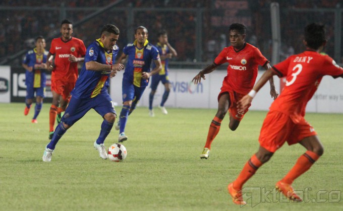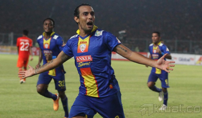 Pesepakbola Arema Cronus Gustavo Lopez melakukan selebrasi usai menjebol gawang Persija dalam pertandingan Indonesia Super League yang berlangsung distadion Gelora Bung Karno Senayan, Jakarta (4/5/2014). Arema Cronus berhasil menghalahkan Persija Jakarta dengan skor 0-1. Aktual/Bagas Triputro