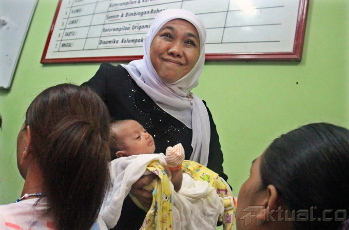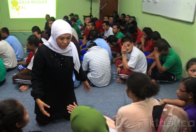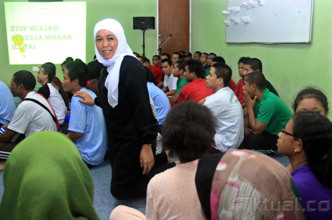 Menteri Sosial Khofifah Indarparawansah (tengah) menjumpai sejumlah TKI bermasalah di Rumah Perlindungan Trauma Center (RPTC), Bambu Apus, Jakarta Timur, Jumat (26/12/2014). RPTC menampung 95 TKI yang dideportasi dari Malaysia untuk mendapat perawatan kesehatan jasmani dan psikologis selama sekitar dua pekan. AKTUAL/MUNZIR