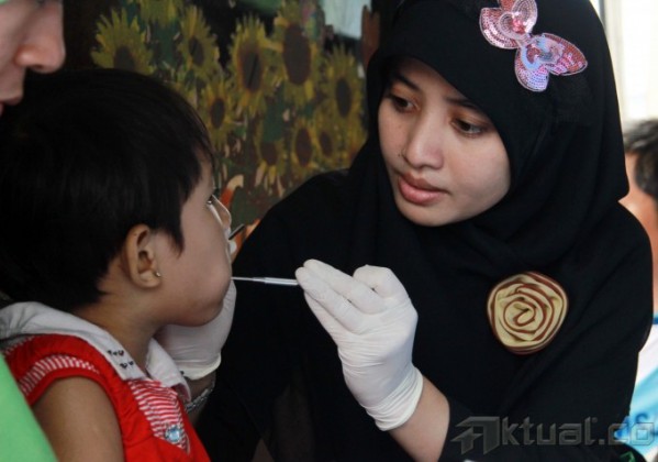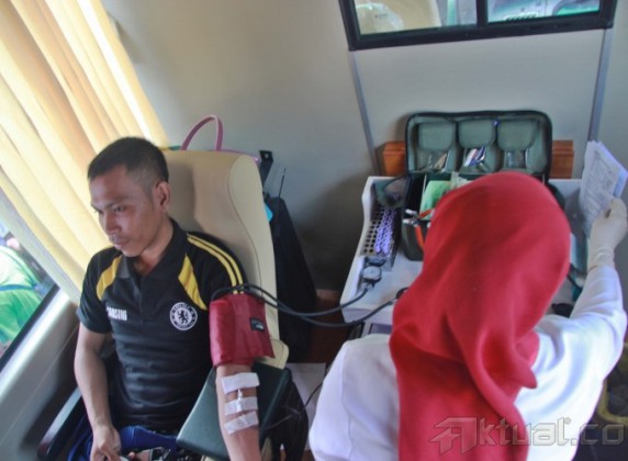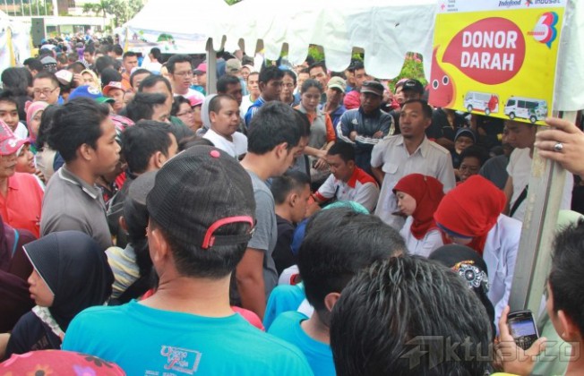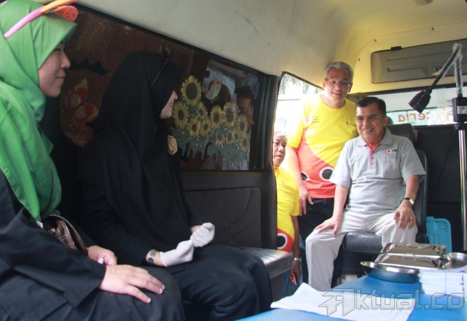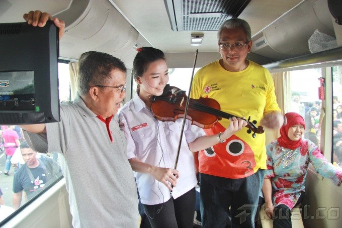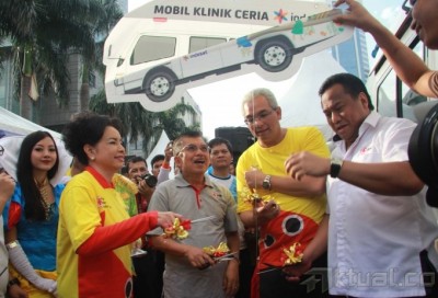 Ketua Umum Palang Merah Indonesia (PMI) Jusuf Kalla (tengah), didampingi Ketua Pengurus Provinsi PMI DKI Jakarta Rini Sutiyoso (kedua kiri), Director & Chief Wholesale and Infrastructure Officer PT Indosat Tbk Fadzri Sentosa (kedua kanan), Wakil Ketua PMI Rachmat Gobel (kanan) saat acara donor darah dan pengobatan gratis anak di Kawasan Bundaran Hotel Indonesia, Jakarta, Minggu (15/9/2013). Kegiatan tersebut dalam rangka perayaan HUT PMI ke-68 dengan mengambil tema “Kaum Muda Sebagai Agen Perubahan” sekaligus meluncurkan Mobil Klinik Ceria. Aktual/Tino Oktaviano