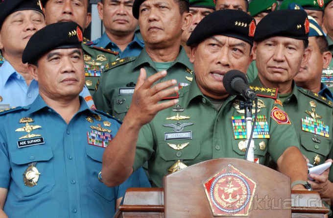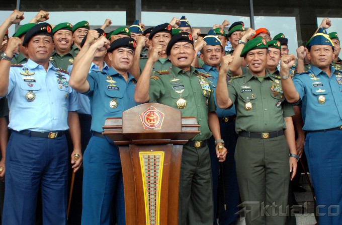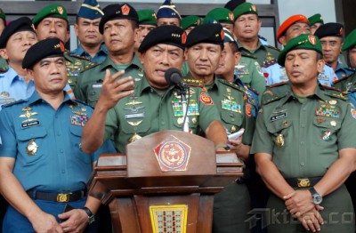Panglima TNI Jenderal TNI Moeldoko (tengah) didampingi sejumlah perwira tinggi TNI memberikan keterangan kepada wartawan seusai menggelar Rapat Kordinasi dengan memberikan pengarahan kepada seluruh jajarannya di Mabes TNI Cilangkap, Jakarta, Jumat (13/6/2014). Rapat koordinasi dilakukan untuk lebih memantapkan diri dalam menghadapi Pemilu Presiden dan Wakil Presiden (Pilpres) 9 Juli mendatang. Aktual/Puspen TNI