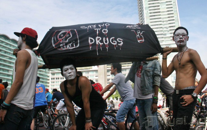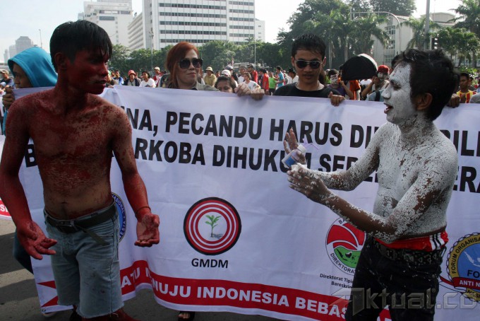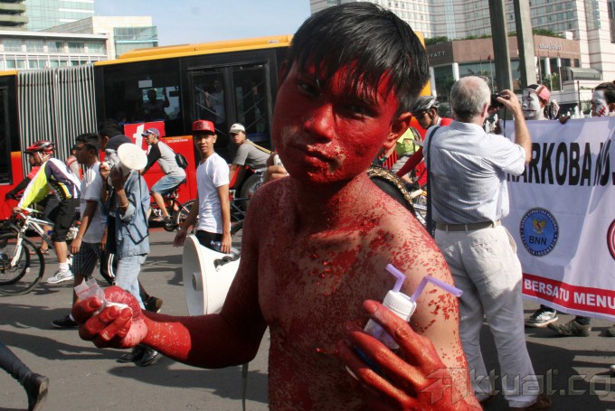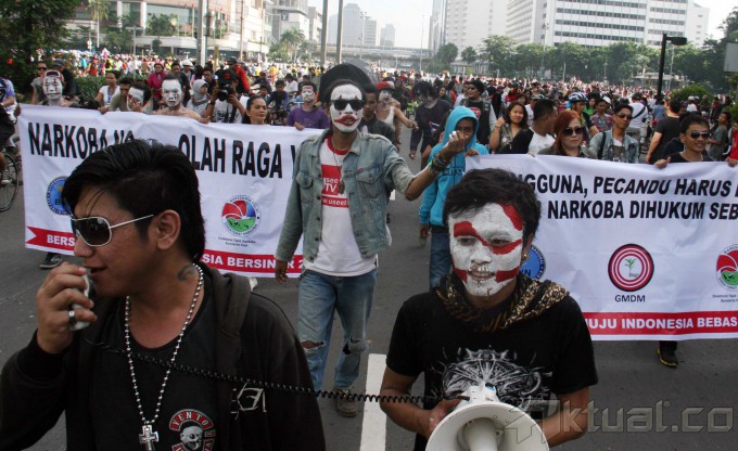 Sejumlah orang melakukan aksi anti narkoba di kawasan Jalan MH Thamrin, Jakarta Pusat, Minggu (13/4/2014). Aksi ini untuk pencegahan penyalahgunaan narkoba yang merusak pemuda sebagai penerus bangsa. Kegiatan yang diikuti oleh ratusan orang tersebut, untuk mewujudkan Masyarakat Indonesia Sehat Tanpa Narkoba. Aktual/Tino OKtaviano