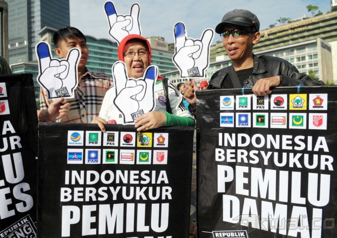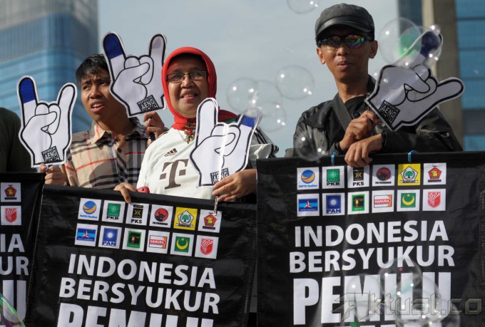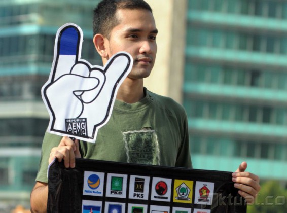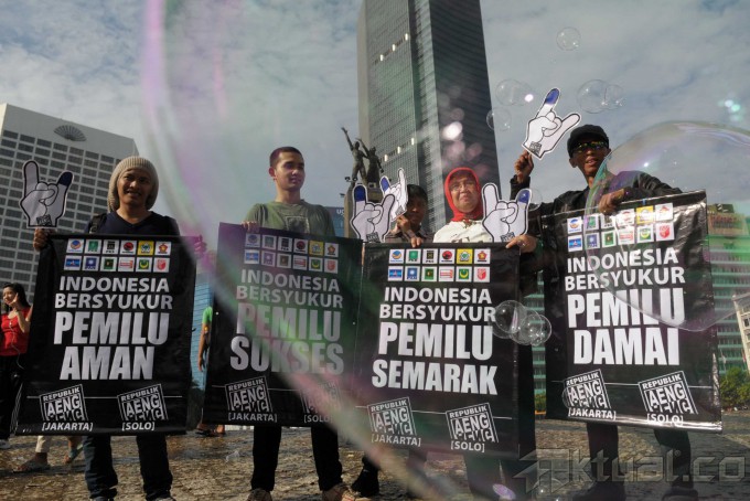 Perwakilan republik Aeng-Aeng dan Pasopati mengelar spanduk dan poster kampanye damai di Bundaran Hotel Indonesia, Jakarta Pusat, Minggu (13/4/2014). Dalam kampanye tersebut pemilu legislatif berlangsung sukses dan damai. Aktual/Tino Oktaviano