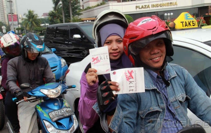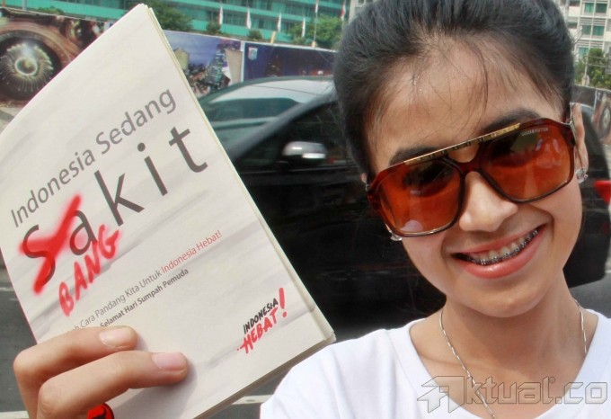 Seorang aktivis Partai Demokrasi Indonesia Perjuangan (PDIP) memperlihatkan stiker bertuliskan “Indonesia Sedang Bangkit” dan “Orang Muda Pemimpin” saat aksi damai dalam rangka hari Soempah Pemoeda di Bundaran Hotel Indonesia, Jakarta, Senin (28/10/2013). PDIP mengajak bangsa Indonesia untuk Bangkit memperjuangkan nasibnya sendiri bebas dari kepentingan negara asing, seperti yang di cita-citakan pendiri bangsa Indonesia terdahulu. Agar Indonesia bangkit dari keterpurukan dan persoalan yang masih melanda bangsa seperti masalah Korupsi,kemiskinan dan penganguran. Aktual/Tino Oktaviano