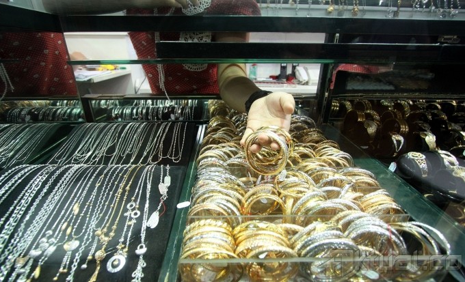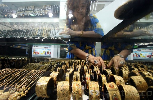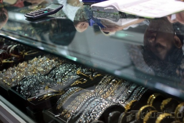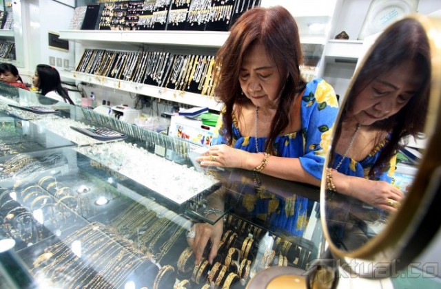 Pedagang melihat emas dengan menggunakan alat pembesar di salah satu toko emas di Pasar Cikini, Jakarta Pusat, Minggu (14/7). Harga emas mengalami kenaikan setelah sepekan kemarin mengalami penurunan drastis. Di pusat penjualan emas Cikini, harga emas naik dari Rp 430.000/gram menjadi Rp 438.000/gram. Aktual/Tino Oktaviano