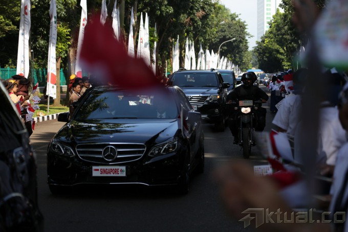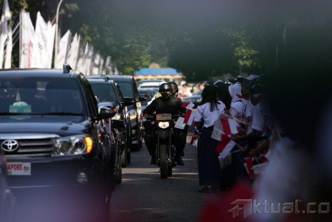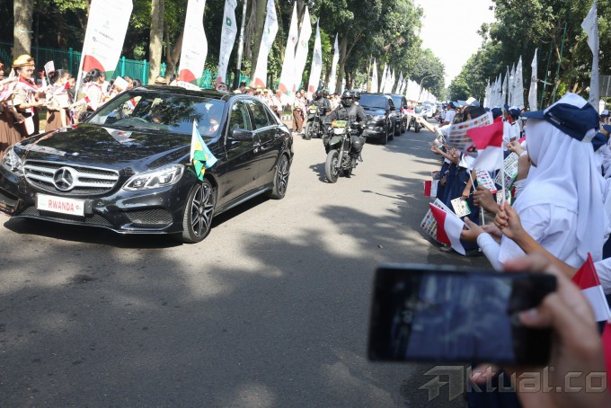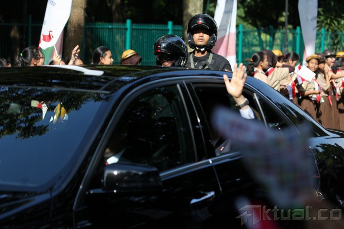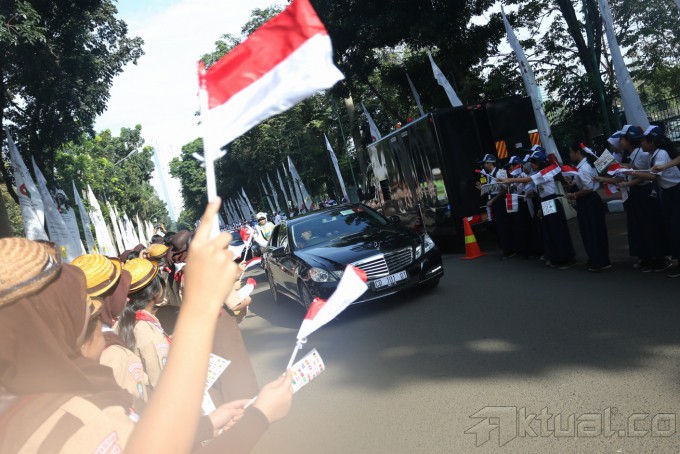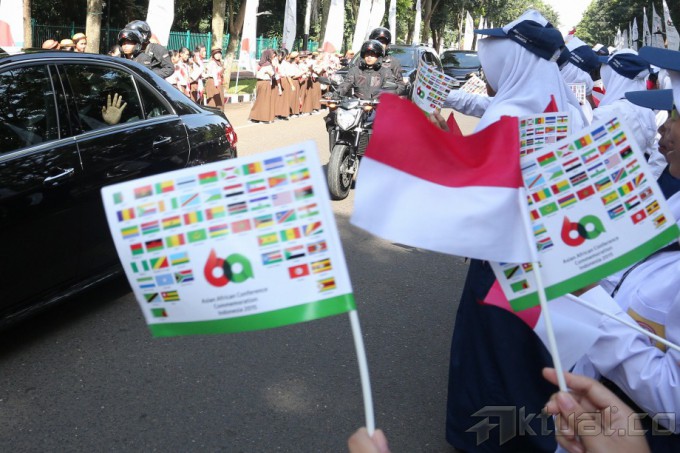 Pelajar menyambut tamu peserta Konferensi Tingkat Tinggi Asia Afrika di depan Jakarta Convention Center, Rabu (22/4). AKTUAL/TINO OKTAVANO