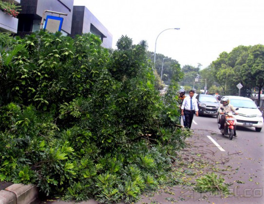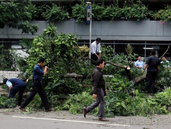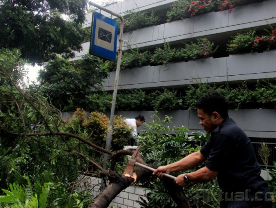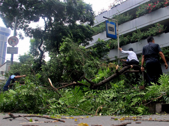 Beberapa karyawan gedung memotong bagian pohon yang tumbang berada samping gedung Wisma Antara, Jalan H Agus Salim, Jakarta Pusat, Senin (13/2015). Pohon tumbang ini memakan badan jalan dan membuat arus lalulintas disekitar tersebut terganggu dan mengakibatkan kemacetan. AKTUAL/MUNZIR