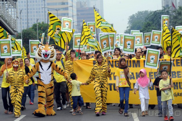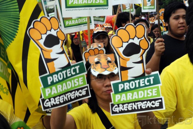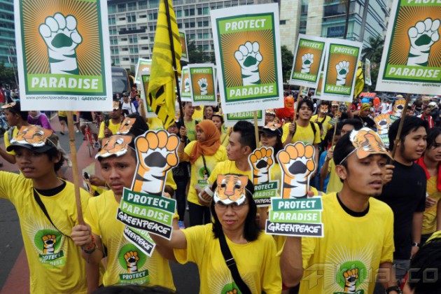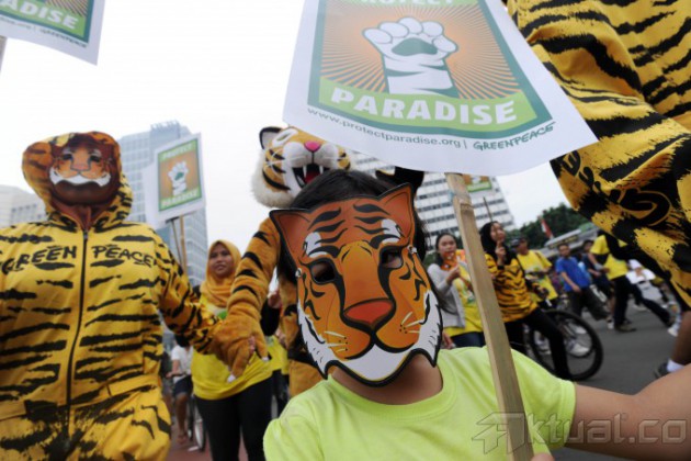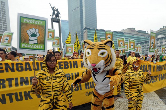 Sejumlah aktivis dan sukarelawan bersama Greenpeace melakukan aksi nasional untuk hutan indonesia di Bundaran Hotel Indonesia, Jakarta, Minggu (15/12/2013). Aksi ini bertujuan untuk mengajak masyarakat dalam menjalankan komitmen untuk melindungi hutan Indonesia. Aktual/Tino Oktaviano
