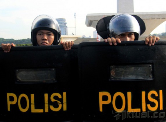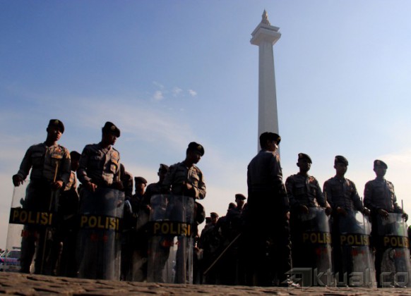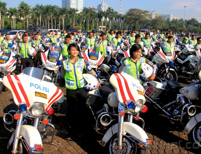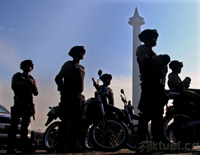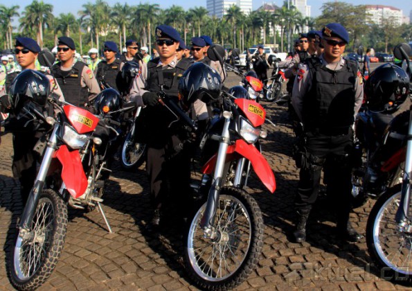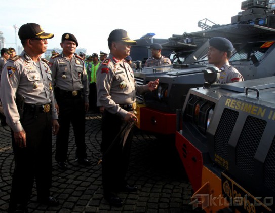 Kapolda Metro Jaya Irjen Pol Unggung Cahyono (tengah) memeriksa kerapian personel ketika memimpin apel gelar pasukan pengamanan peringatan 60 tahun Konferensi Asia Afrika (KAA) di Kawasan Monas, Jakarta, Rabu (8/4/2015). Polda Metro Jaya menerjunkan 4.236 personel untuk mengamankan pelaksanaan Peringatan KAA di Jakarta yang diselenggarakan pada 18-23 April mendatang. AKTUAL/MUNZIR