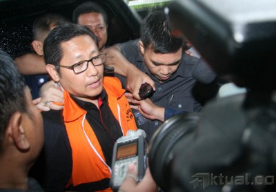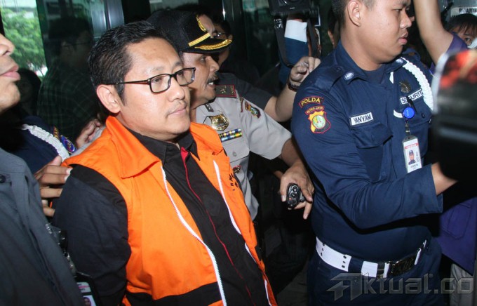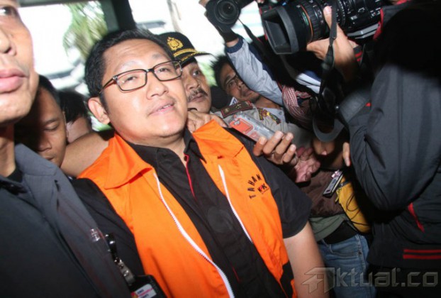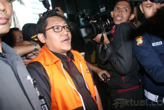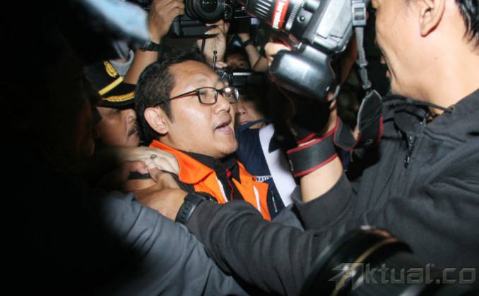 Mantan Ketua Umum Partai Demokrat Anas Urbaningrum, diserbu wartawan saat akan menjalani pemeriksaan pertama kali setelah di tahan di gedung Komisi Pemberantasan Korupsi (KPK), Jumat (17/1/2014). Anas ditetapkan sebagai tersangka kasus dugaan pemberian dan janji dalam kaitan proyek Hambalang dan proyek lainnya. Dalam surat perintah penyidikan, melanggar pasal 12 a, b atau pasal 11 Undang-undang 31 tahun 1999 tentang tindak pidana korupsi. Aktual/Tino Oktaviano