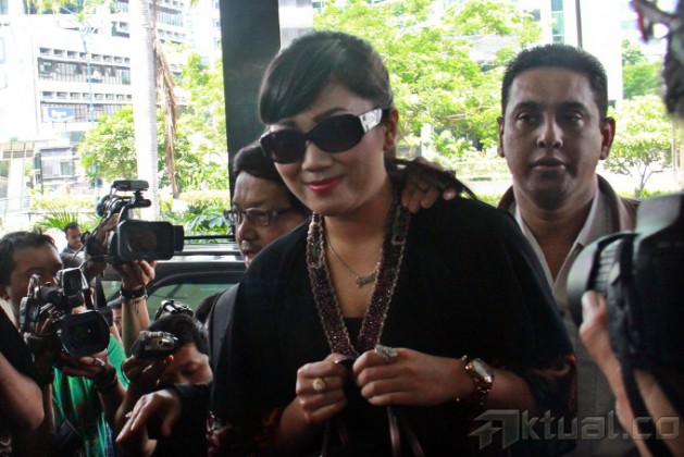 Pedangdut Rya Fitria, didampingi pengacaranya saat akan diperiksa Komisi Pemberantasan Korupsi (KPK), Jakarta, Kamis (21/11/2013). Pedangdut asal Bandung Jawa Barat itu diduga ikut terseret kasus dugaan korupsi yang melanda mantan Ketua Mahkamah Konstitusi (MK) Akil Mochtar. Aktual/Tino Oktaviano