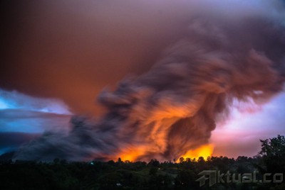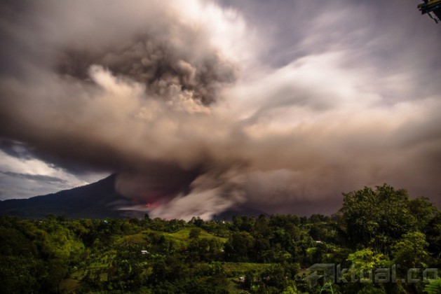 Gunung Sinabung mengeluarkan material vulkanik disertai lava pijar, tampak dari Desa Tiga Pancur, Karo, Sumatera Utara, Kamis (2/4) malam. Aktivitas Gunung Sinabung sejak sepekan terakhir terus meningkat. ANTARA FOTO/Endro Lewa