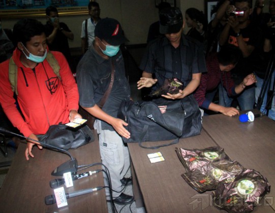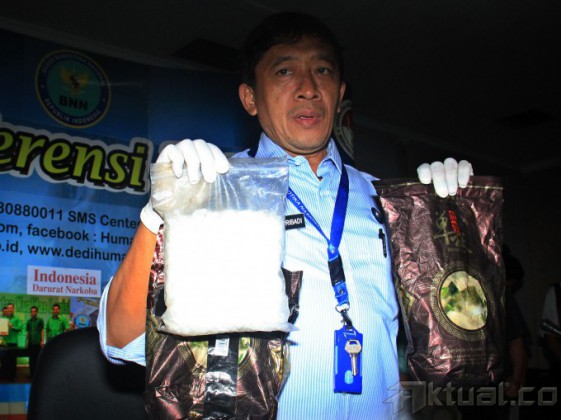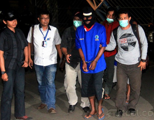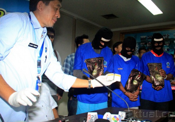 Tiga tersangka menggunakan penutup kepala dikawal petugas Badan Narkotika (BNN) saat jumpa pers dengan wartawa di kantor BNN, Jalan MT Haryono, Cawang, Jakarta Timur, Kamis (16/4/2015), malam. Tiga anak buah kapal jaringan Malaysia – Aceh berhasil ditangkap aparat BNN di Dermaga Pelabuhan Batubara, Sumatera Utara karena terkait penyelundupan narkoba jenis sabu seberat 10 kg. AKTUAL/MUNZIR