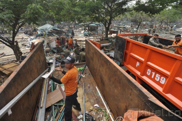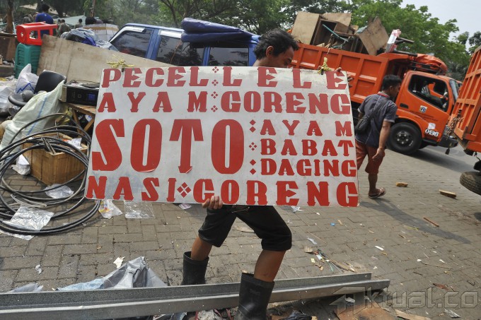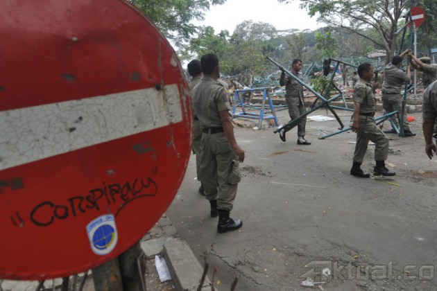 Petugas Satpol PP membongkar lapak pedagang di lapangan IRTI Monas, Jakarta, Kamis (16/10/2014). Sebanyak 1.500 personil Satpol PP DKI Jakarta diterjunkan untuk membongkar lapak pedagang PKL sebagai upaya menata kembali kawasan Monas. AKTUAL/ANTARA FOTO/Wahyu Putro