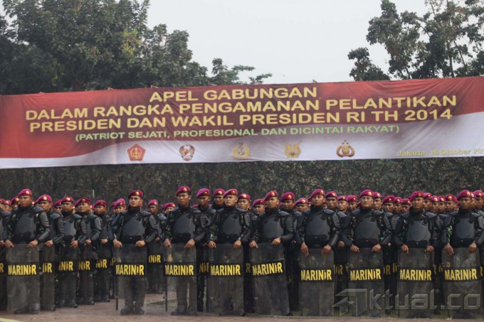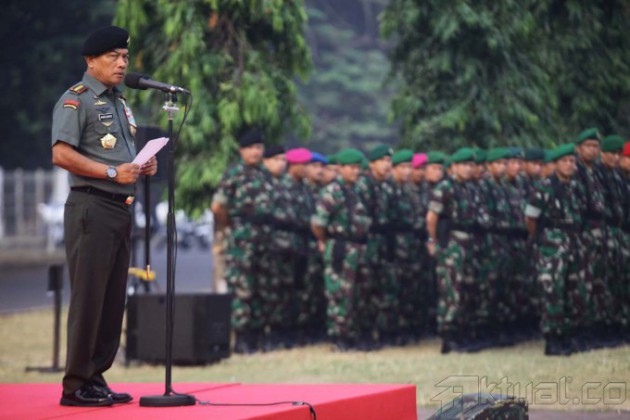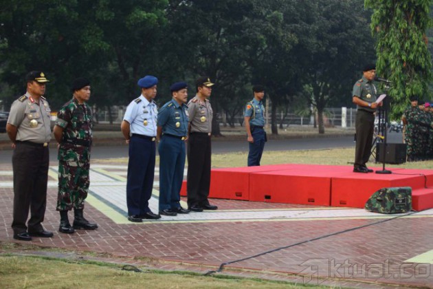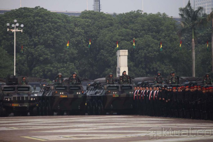 Panglima TNI Jenderal Moeldoko (kanan) didampingi Kapolri Jenderal Sutarman, Kasal Laksamana TNI Marsetio dan Kasau Marsekal Ida Bagus Putu Dunia saat memimpin apel pasukan TNI dan Polri di Senayan, Jakarta Selatan, Kamis (16/10/2014). Sebanyak 24000 pasukan dari TNI dan Polri mengikuti apel di Senayan, Jakarta Selatan, Kamis (16/10). Apel gabungan ini dalam rangka persiapan pengamanan jelang upacara pelantikan presiden dan wakil presiden pada 20 Oktober mendatang. AKTUAL/PUSPEN TNI