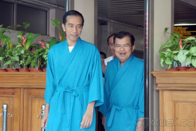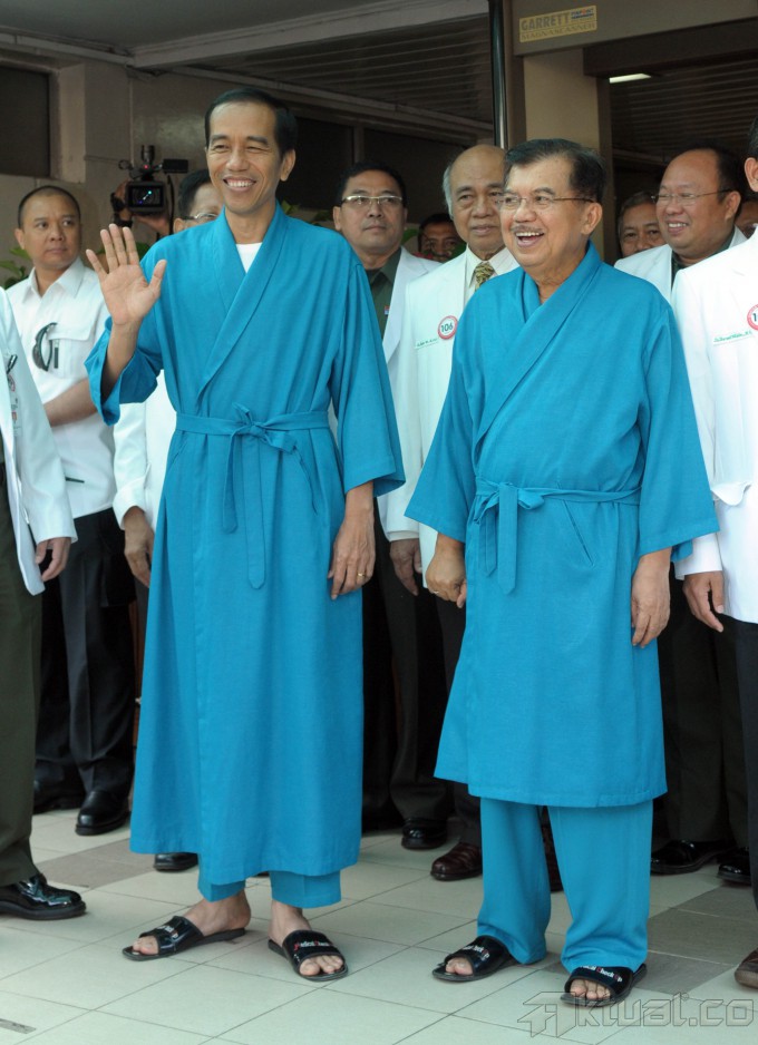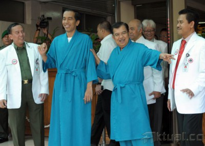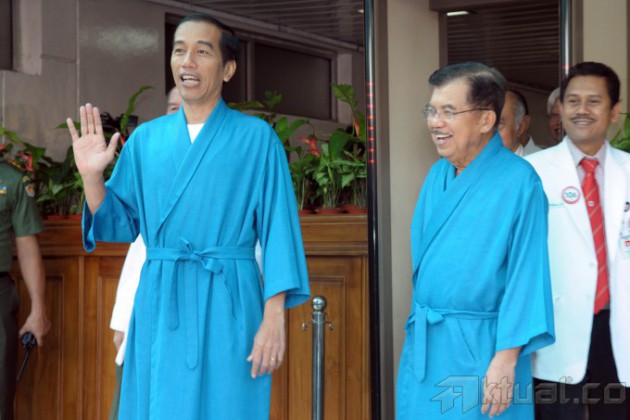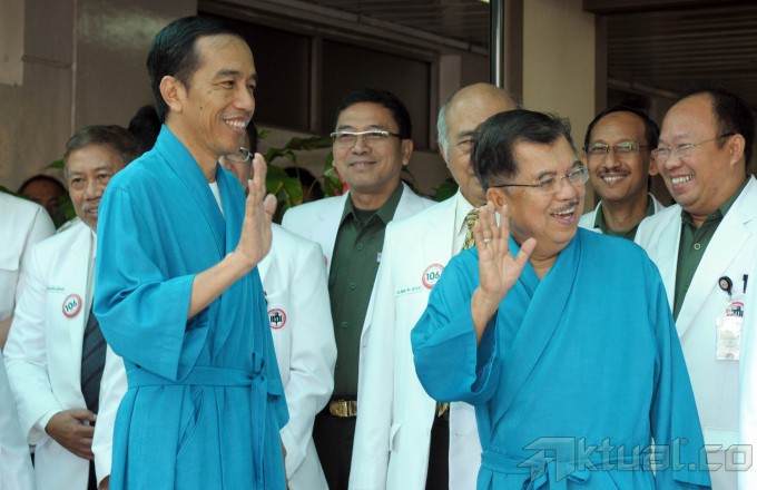Pasangan Capres dan Cawapres Joko Widodo (Jokowi) dan Jusuf Kalla (JK), melambaikan tangan saat akan menjalani pemeriksaan kesehatan di Rumah Sakit Pusat Angkatan Darat (RSPAD), Gatot Subroto, Jakarta Pusat, Kamis (22/5/2014). Keduanya akan menjalani proses rangkaian pemeriksaan kesehatan selama 8 jam. Selama proses pemeriksaan kesehatan, capres dan cawapres tidak diperkenankan keluar atau bertemu dengan siapapun, kecuali keluarga terdekat saat jam istirahat. Aktual/Tino Oktaviano