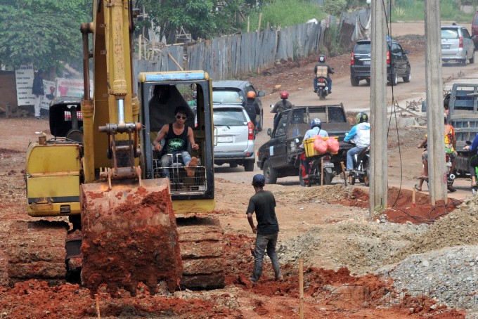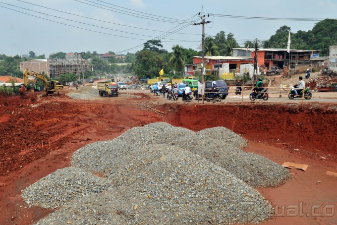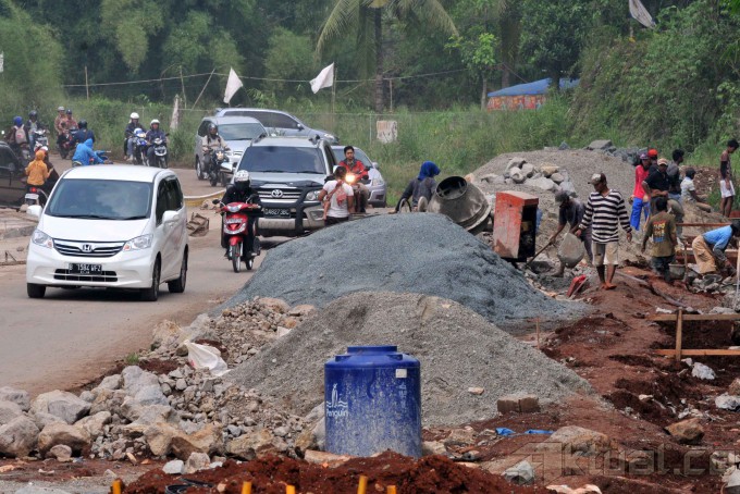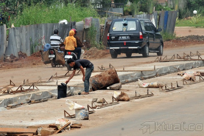 Sejumlah pekerja menyelesaikan proyek pelebaran Jalan Ciater menuju BSD di perempatan Meruga di Tangerang Selatan, Banten, Rabu (6/11/2013). Proyek pelebaran jalan ini dibangun untuk mengurangi kemacetan jalur Ciater hingga Simpang Maruga yang sering terjadi pada saat pagi dan sore hari. Diperkirakan proyek ini rampung pada Desember 2013. Aktual/Tino Oktaviano