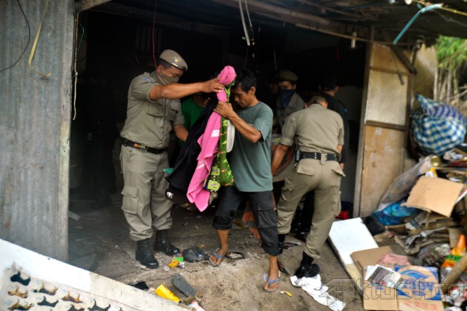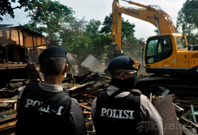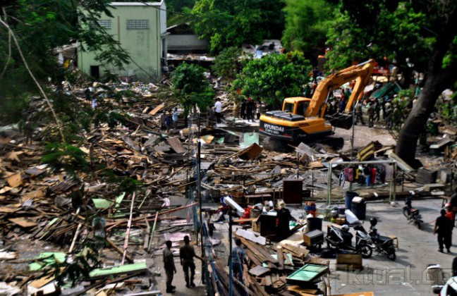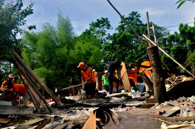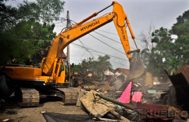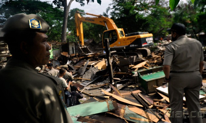 Aparat SatPol PP dibantu alat berat membongkar kios pedagang kaki lima dan bangunan liar di Jalan Tebet Barat Raya, Jakarta Selatan, Rabu (3/12/2014). Pemerintah Kota Administrasi Jakarta Selatan melakukan pembongkaran 170 bangunan liar ini untuk merefungsi taman sebagai Ruang Terbuka Hijau (RTH). AKTUAL/MUNZIR