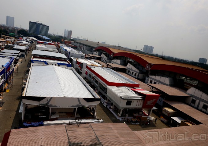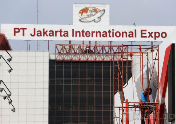 Para pekerja sibuk mempersiapkan stan-stan yang berada di arena Pekan Raya Jakarta di Kemayoran, Jakarta Pusat, Rabu (27/5/2015). Pameran terbesar di Indonesia Pekan Raya Jakarta (PRJ) / Jakarta Fair tahun ini akan dimajukan terhitung mulai tanggal 29 Mei 2015 hingga 5 Juli 2015 selama 38 hari. AKTUAL/MUNZIR