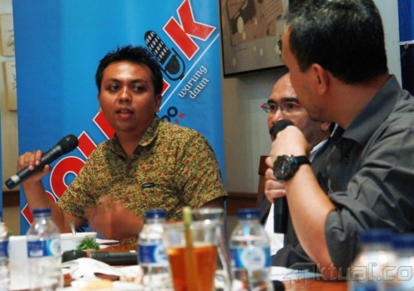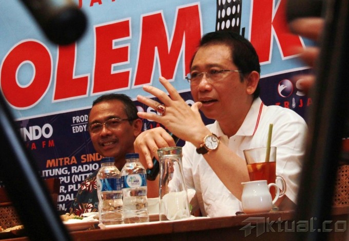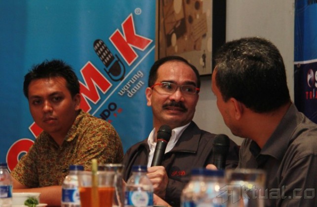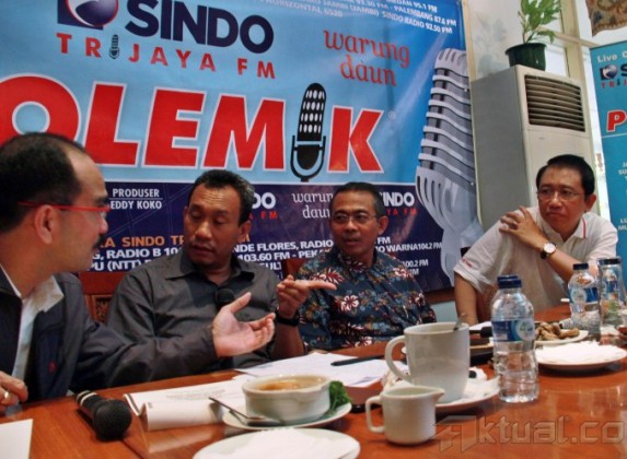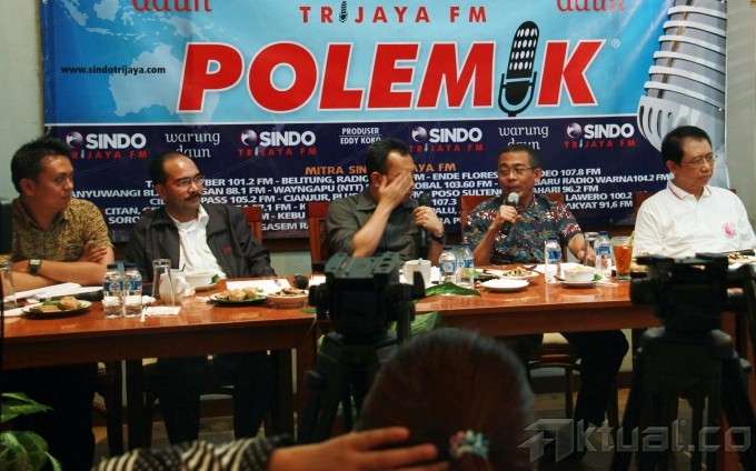 Dari kiri ke kanan, Peneliti Indonesia Legal Roundtable Erwin Natosmal Oemar, Politisi dan Mantan Anggota DPR Firman Jaya Daeli, Ketua Bidang Pengawasan Hakim dan Investigasi Komisi Yudisial Erman Suparman dan Ketua DPR RI Marzuki Alie, menjadi pembicara dalam diskusi mingguan Polemik dengan tema “Transaksionalisasi Ala DPR” di Warung Daun, Jakarta, Minggu (21/9/2013). Menurut Marzuki Alie, Kompetensi anggota DPR tidak semuanya memenuhi syarat, rekrutmen belum sesuai dengan kompetensinya. (Penempatan) semau-maunya fraksi. Orang hukum ditempatkan di tempat yang aneh-aneh. Aktual/Tino Oktaviano