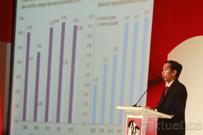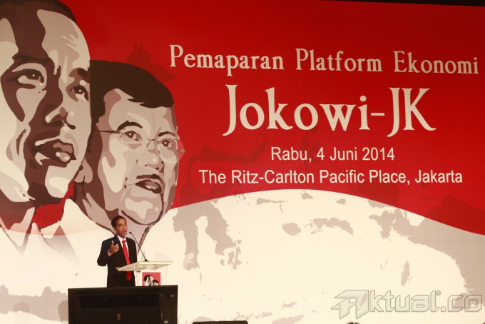 Calon Presiden Joko Widodo memberikan pemaparan dalam acara Paparan Platform Ekonomi Jokowi-JK di The Ritz Carlton Pacific Place, Jakarta, Rabu (4/6/2014) malam. Acara yang diselenggarakan oleh kelompok Profesional Pendukung Joko Widodo-Jusuf Kalla atau KPP JOKOWI-JK didasari oleh pemikiran perlunya masyarakat, khususnya kalangan bisnis, untuk mengetahui dan memahami arah prioritas kebijakan ekonomi pemerintah Capres dan Cawapres Joko Widodo-Jusuf Kalla secara langsung. Aktual/Tino Oktaviano
