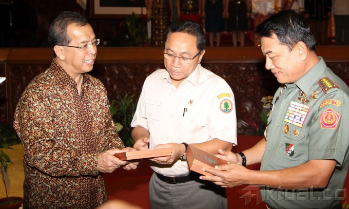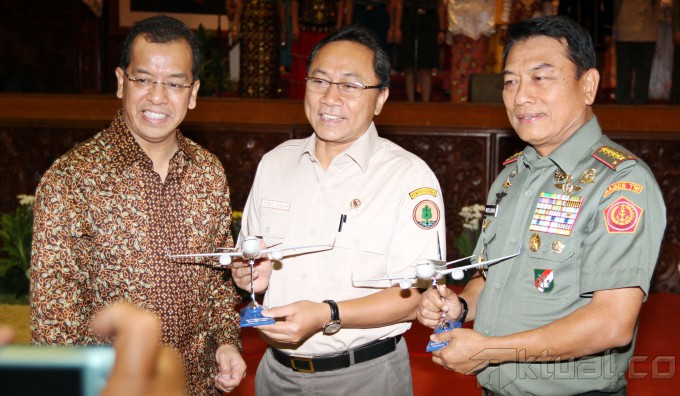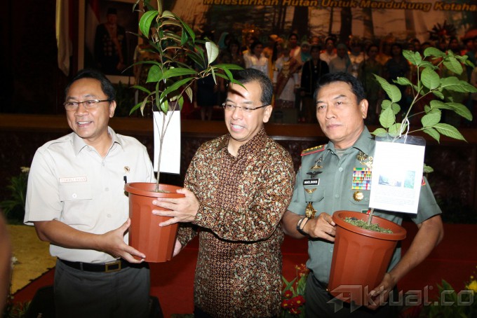 Menteri Kehutanan Zulkifli Hasan (kiri), Dirut PT Garuda Indonesia Tbk (persero) Emirsyah Satar (tengah) dan Panglima Tentara Nasional Indonesia (TNI) Jenderal TNI Moeldoko (kanan) berbincang sambil membawa bibit pohon usai melakukan kerjasama di gedung Kemeterian Kehutanan, Jakarta, Jumat (7/2/2014). Kemenhut bekerjasama dengan TNI dan Garuda Indonesia, bersatu padu melestarikan hutan untuk mendukung ketahanan nasional dalam rehabilitasi hutan konservasi. Hasil identifikasi ditetapkan dengan keputusan Menhut Nomor SK. 781/Menhut-II/2012 ada seluas 27.290.000 Ha yang terdiri dari 22.020.000 Ha dengan kategori kritis sampai dengan sangat kritis dan 5.270.000 Ha dengan kategori agak kritis. Aktual/Tino Oktaviano