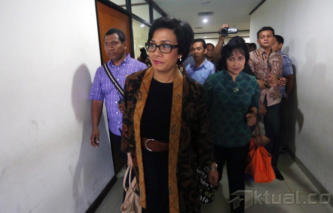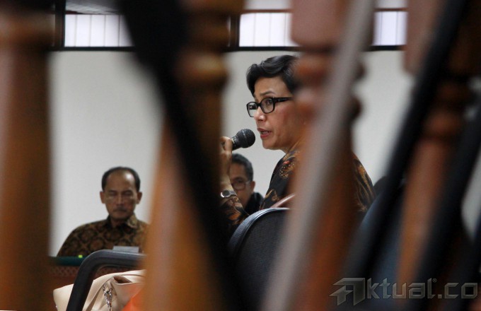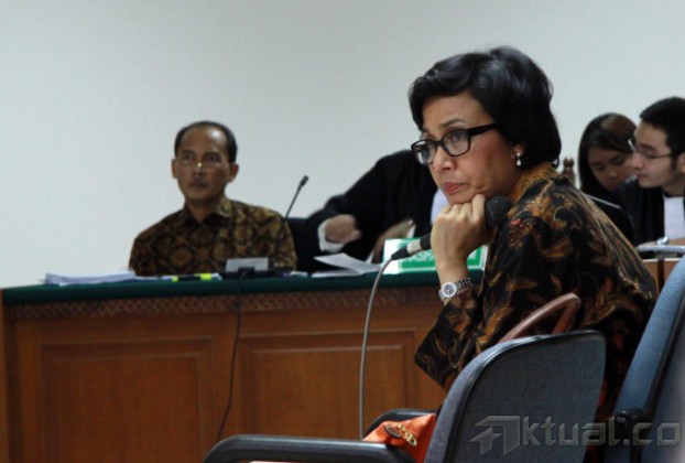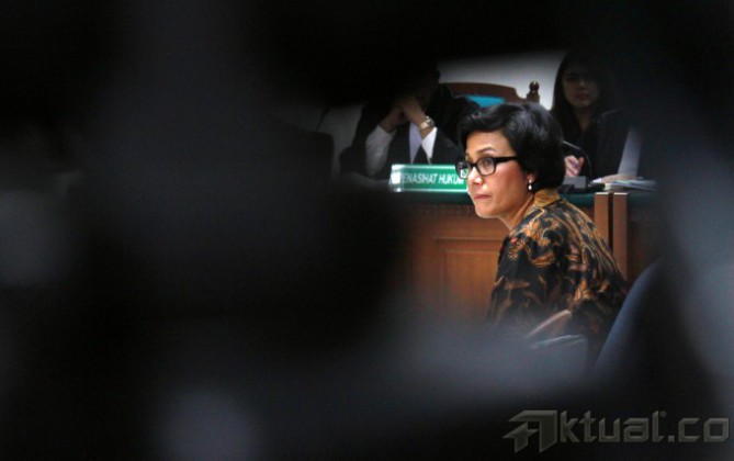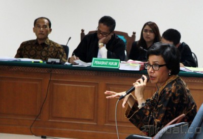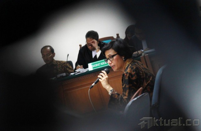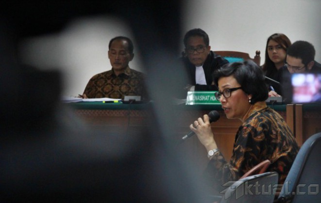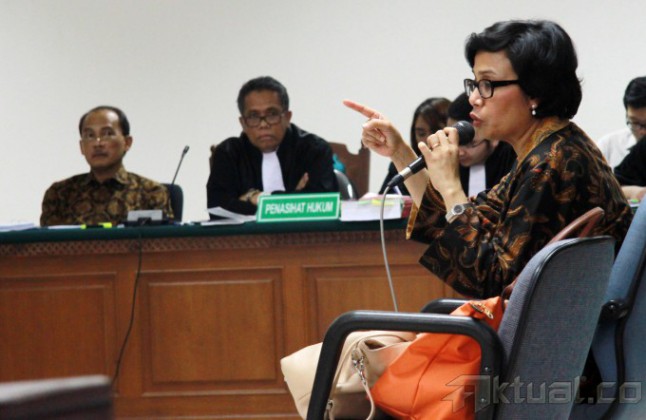 Mantan Menteri Keuangan Sri Mulyani Indrawati, saat menjadi saksi sidang kasus Bank Century di pengadilan Tindak Pidana Korupsi (Tipikor), Jakarta, Jumat (2/5/2014). Mantan Menteri Keuangan sekaligus Ketua Komite Stabilitas Sistem Keuangan ini kerap disebut turut serta dalam kasus korupsi yang merugikan keuangan negara senilai Rp7,3 triliun itu. Aktual/Tino Oktaviano