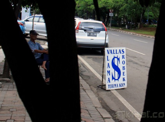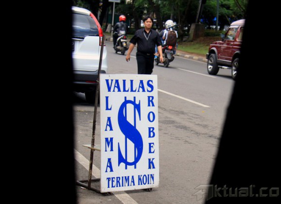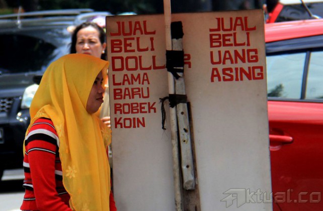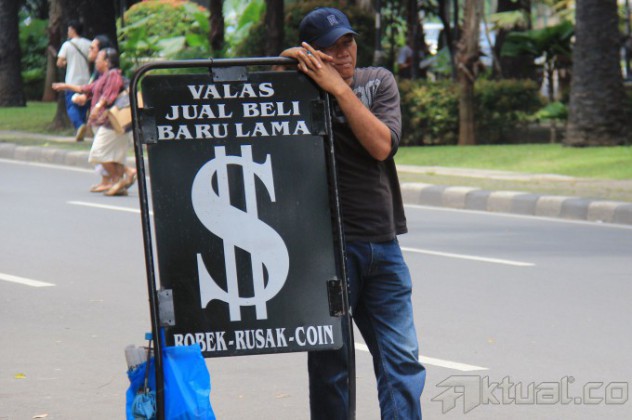 Seorang penjual jasa penukaran valuta asing berdiri samping papan penunjuk dolar menunggu pelanggan di jalan Kwitang, Jakarta Pusat, Jumat (13/3/2015). Nilai tukar rupiah terhadap dollar AS pada awal perdagangan di pasar spot kembali diuji kekuatannya di akhir pekan ini, rupiah dibuka turun tipis ke Rp 13.185 per dollar AS, dibanding penutupan kemarin pada Rp 13.183. AKTUAL/MUNZIR