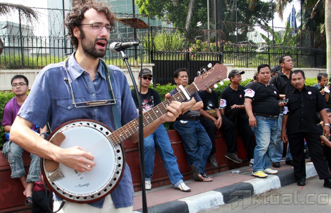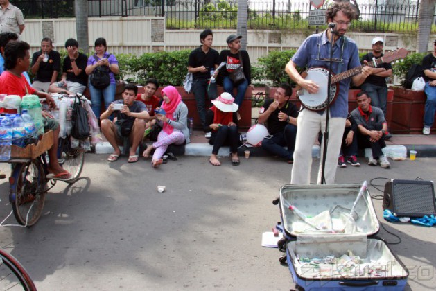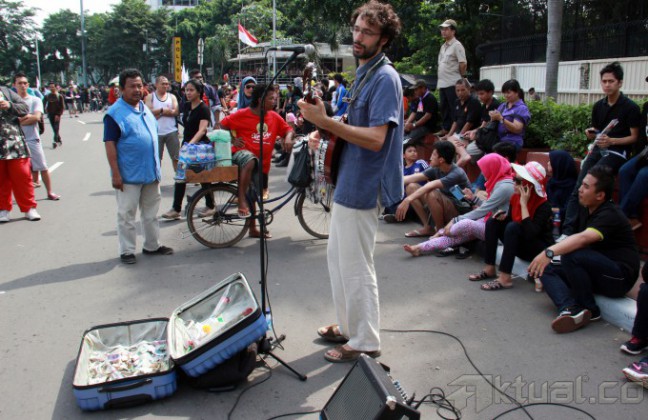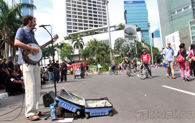 Ram warga negara asing asal Milan, Italia mengamen saat acara Car Free Day (CFD) di kawasan Bundaran Hotel Indonesia, Jakarta, Minggu (27/4/2014). Ram yang sedang melakukan study di sekolah musik Faraby itu, menggunakan Banjo untuk menghibur warga yang sedang berolah raga di kawasan Sudirman – Thamrin. Aktual/Tino Oktaviano
