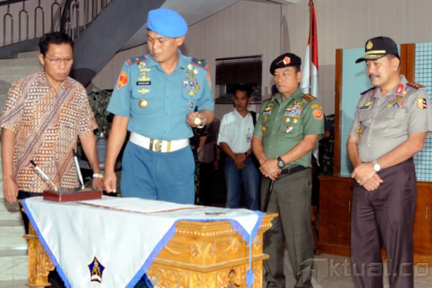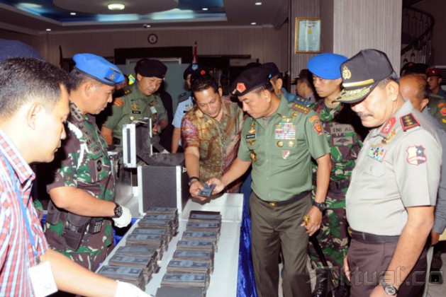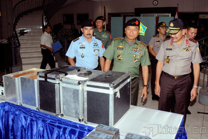 Panglima TNI Jenderal Moeldoko dan Plt Kapolri Komjen Pol Badrodin Haiti menyaksikan penyerahan tersangka warga sipil dan barang bukti berupa narkoba dan black dollar dari penyidik Polisi Militer Komandan Pusat Polisi Militer di Markas Puspomal Kelapa Gading, Jakarta Utara, Jum’at (13/3/2015). Penyerahan barang bukti berupa uang palsu sejumlah 6.900 dollar Amerika Serikat dalam pecahan 100 USD atau kurang lebih 9 milyar rupiah dan juga narkoba jenis sabu, alat suntikan, dan alat hisap sabu ini melibatkan oknum TNI juga melibatkan oknum sipil sehingga harus di proses hukum di Kepolisian. AKTUAL/PUSPEN TNI