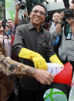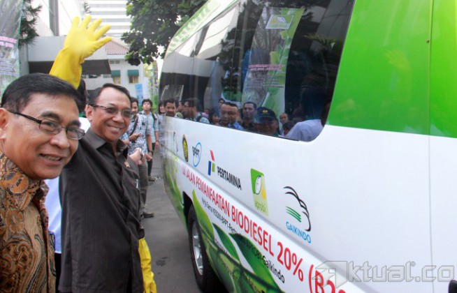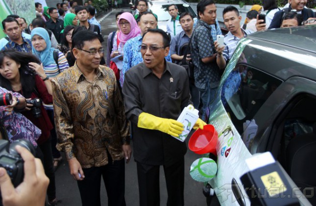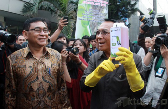 Menteri Energi dan Sumber Daya Mineral (ESDM), Jero Wacik, Didampingi Wakil Menteri ESDM, Susilo Siswoutomo dan Direktur Jenderal Energi Baru, Terbarukan dan Konversi Energi ESDM, Rida Mulyana saat meluncurkan uji jalan pemanfaatan biodiesel di kantor Kementerian ESDM, Jakarta, Kamis (17/7/2014). Uji jalan ini untuk mengurangi ketergantungan terhadap impor BBM dan memanfaatkan Bahan Bakar Nabati (BBN) sebagaimana telah diatur melalui permen ESDM nomor 25 Tahun 2013 yang mewajibkan antara lain pemakaian biodiesel sebesar 20% pada kendaraan bermotor pada 2016. Aktual/Tino Oktaviano