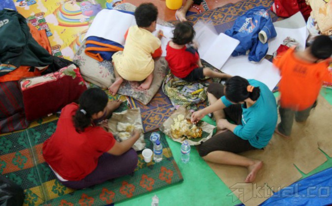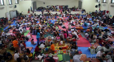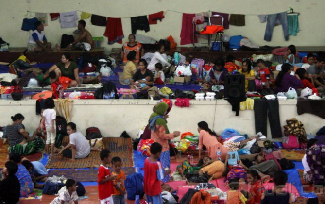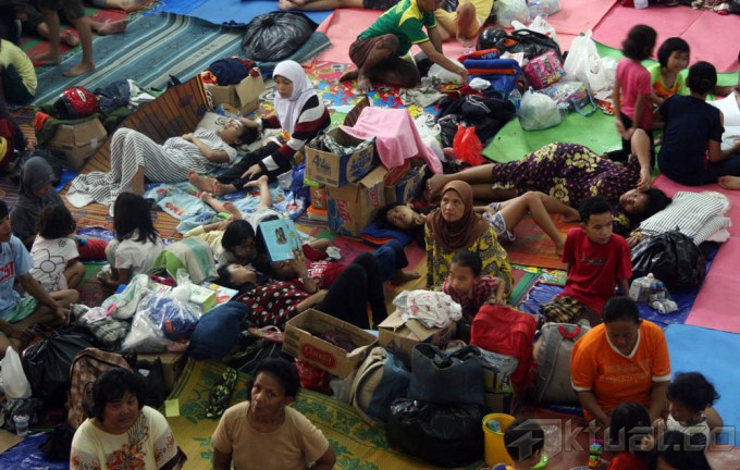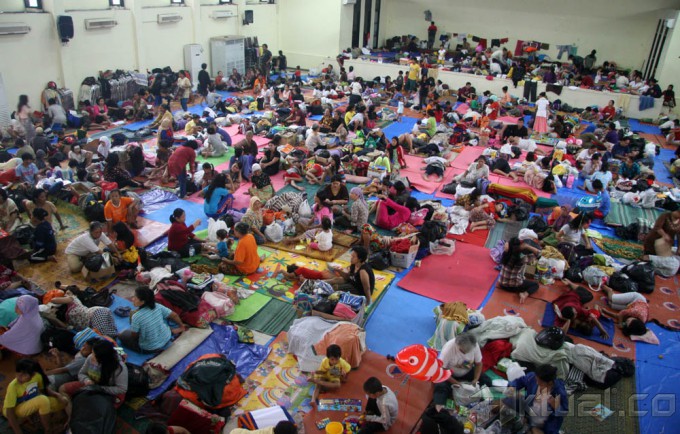 Ratusan pengungsi menempati tampak beristirahat di Gelanggang Olah Raga (GOR) Otista, Jatinegara, Jakarta Timur, Minggu (19/1/2014). Pusat Pengendalian Operasional Badan Penanggulangan Bencana Daerah (Pusdalops BPBD) DKI Jakarta mencatat Saat ini sekitar 17.041 warga yang tinggal di 207 RT, 128 RW, 33 Kelurahan, dan 24 Kecamatan yang terkena banjir kali ini. Sedangkan jumlah pengungsi yang terlapor sebanyak 4.000 jiwa lebih yang berada di titik-titik Posko Pengungsian, namun jumlah tersebut sebenarnya lebih banyak, karena masih banyak pihak kelurahan yang belum melapor. Aktual/Tino Oktaviano