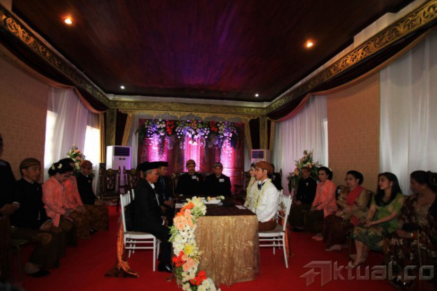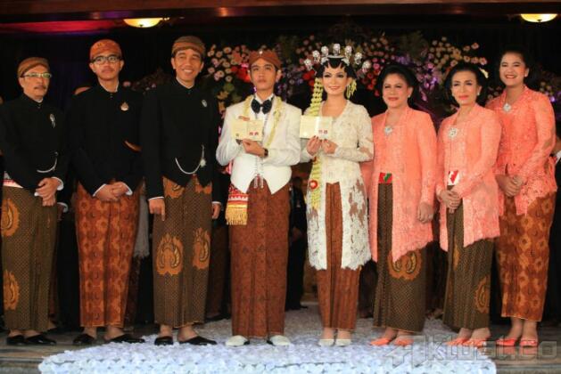 Putra Presiden Joko Widodo, Gibran Rakabuming Raka (kedua kiri) dan istri Selvi Ananda (kedua kanan) didampingi Presiden Joko Widodo (kiri) dan Ibu Negara Iriana Joko Widodo (kanan), menunjukkan buku nikah seusai prosesi akad nikah di Gedung Graha Saba, Solo, Jawa Tengah, Kamis (11/6). ANTARA FOTO/Maulana Surya