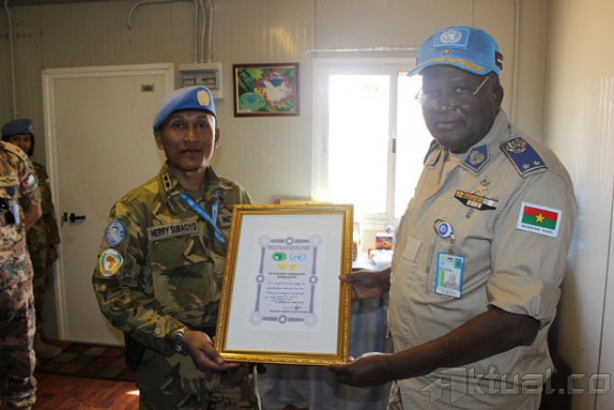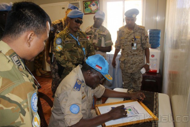 Komandan Sektor Barat United Nations Mission In Darfur Brigjen Nikiema Blaise (kiri) didampingi Dansatgas Konga XXXV-A/Unamid Letkol Inf Herry Subagyo (tengah) melambaikan tangan menyapa Prajurit TNI yang tergabung dalam Satgas Batalyon Komposit TNI Konga XXXV-A/Unamid yang dipimpin oleh Letkol Inf Herry Subagyo di Camp Indonesian Batalyon (Indobatt), Supercamp Unamid, Darfur Barat, Selasa (24/3/2015). Dalam kesempatan itu, Nikiema Blaise melakukan peninjauan terkait dengan kesiapan pasukan Indonesia, antara lain meninjau Ranpur, Gudang Logistik, Kendaraan Taktis, hingga Camp tempat tinggal pasukan. AKTUAL/PUSPEN TNI